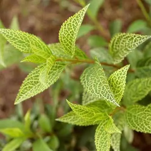 Листья яйцевидной формы, супротивные, с острым вытянутым кончиком и зубчатым краем, длиной 8-12 см. Окраска – зеленая, вдоль жилок проходят яркие кремово-серебристые линии, сплетающиеся в причудливую сетку. Осенью листья корейской форзиции сорта Камсон разукрашиваются в желтые и фиолетовые тона.